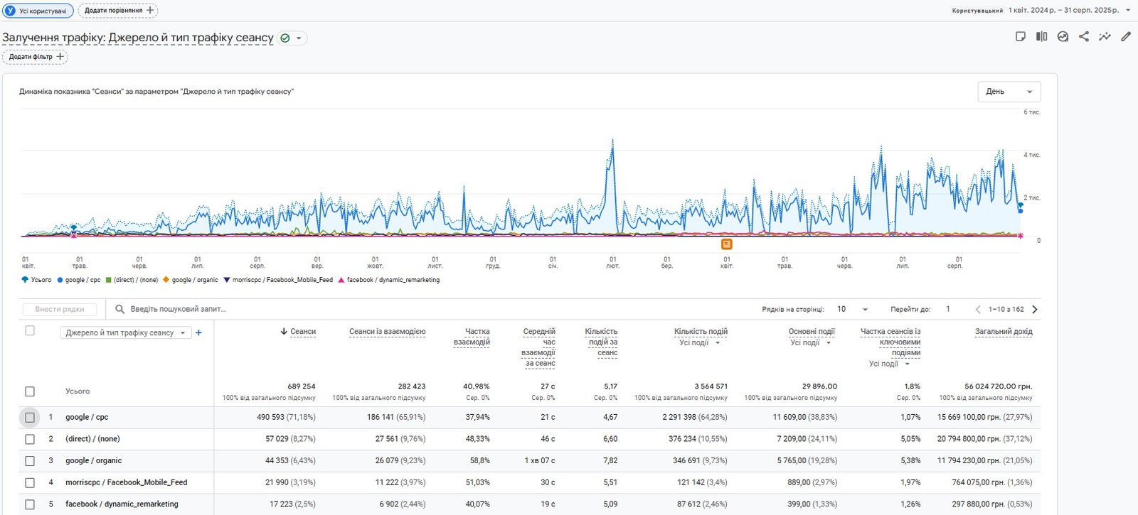 Початково, кампанії були запущені з ціллю "purchase" (покупка) через Google Ads. Однак, перші результати показували високі витрати на конверсії, що вимагало коригувань. Для точнішого аналізу та визначення реальної вартості лідів був підключений коллтрекинг. Це дозволило точно відслідковувати, скільки з конверсій дійсно призводить до продажу, та оптимізувати кампанії для зниження вартості конверсії. Після цього вартість конверсії знизилась з 1200 до 191 грн (при цьому дуже багато продажів було саме з дзвінків)