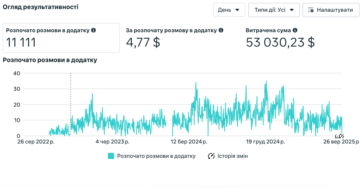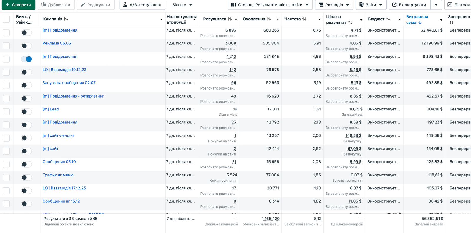 З першого тестового запуску було прийнято рішення працювати з одним плейсментом -- Instagram, тому що більше цільових запитів та продажів було саме з Instagram